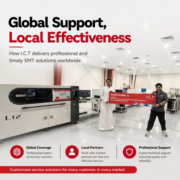 Tại các thị trường như Ả Rập Saudi , nơi chuyên môn trong ngành của SMT địa phương có thể bị hạn chế, I.C.T sẽ tham gia để cung cấp hỗ trợ kỹ thuật toàn diện. Đội ngũ của chúng tôi chịu trách nhiệm hoàn toàn về việc cài đặt, đào tạo và khắc phục sự cố, đảm bảo khách hàng nhận được dịch vụ chuyên nghiệp, kịp thời trực tiếp từ các chuyên gia của chúng tôi.